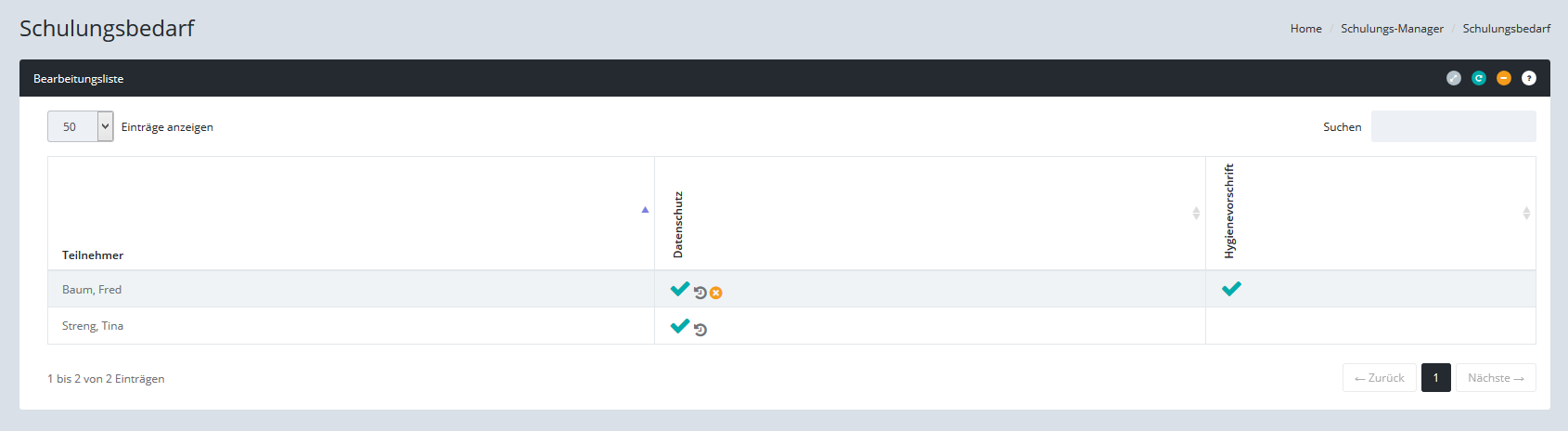 Der Schulungsbedarf ist eine grobe Ansicht darüber, welche Teilnehmer schon welche Qualifizierungen hat.