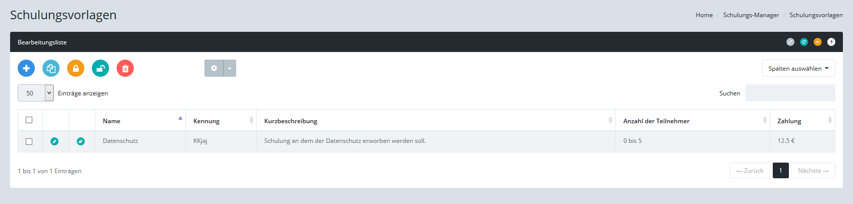 Schulungsvorlagen sind Schablonen für Schulungen. Aus den Kopien von Schulungsvorlagen, werden Schulungen erstellt.