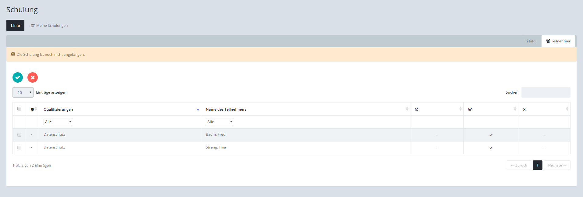 Teilnehmer ist abgemeldet. Steht das Symbol in der Spalte der Qualifizierungen, zeigt es an, dass der Teilnehmer die jeweilige Qualifizierung nicht erhalten hat. |
