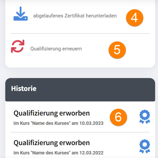 Klick (Tap) auf die Zeile der Liste zeigt die Detailseite der abgelaufenen Qualifizierung an, wo man diese Qualifizierung erneuern kann.