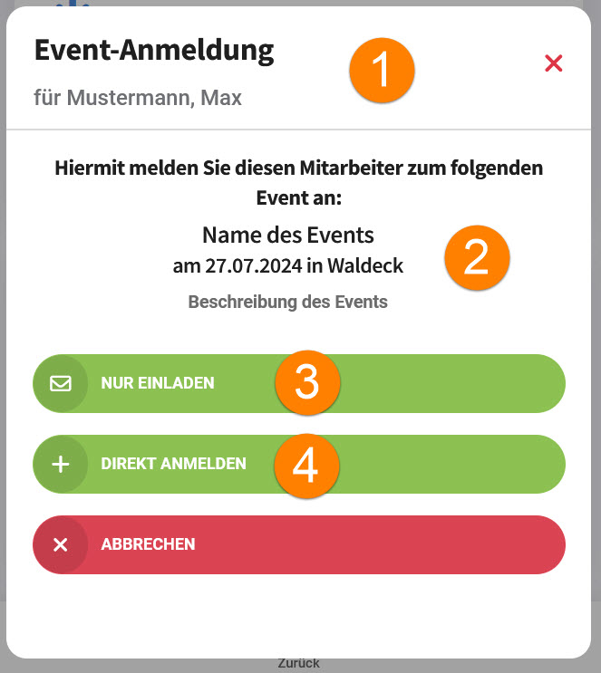 3.Button [Nur einladen] lädt den Mitarbeiter zu dieser Veranstaltung ein.