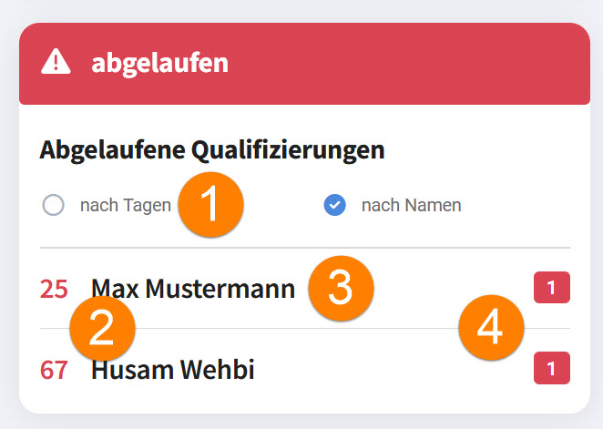 2.Die linke, große Zahl zeigt die Tage seit Ablauf der Qualifizierung an. Falls es für einen Mitarbeiter mehrere abgelaufene Qualifizierungen gibt, wird die höchste Anzahl der abgelaufenen Tage hier angezeigt.