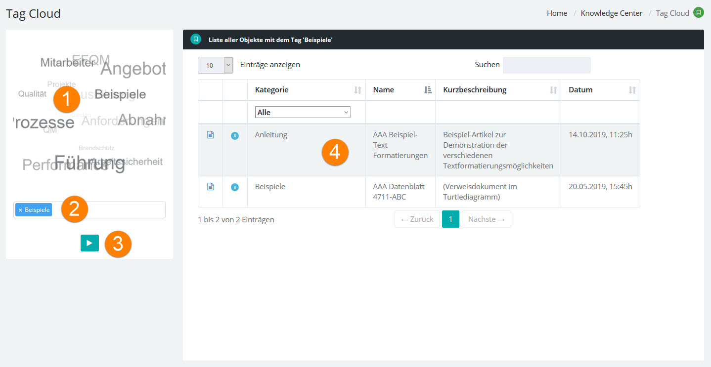 Klicken Sie auf einen Tag in der Cloud, um eine Liste der zugehörigen Dokumente (4) zu sehen. Oder suchen Sie einen Tag im Suchfeld (2) aus. Es kann immer nur ein Tag ausgewählt werden.