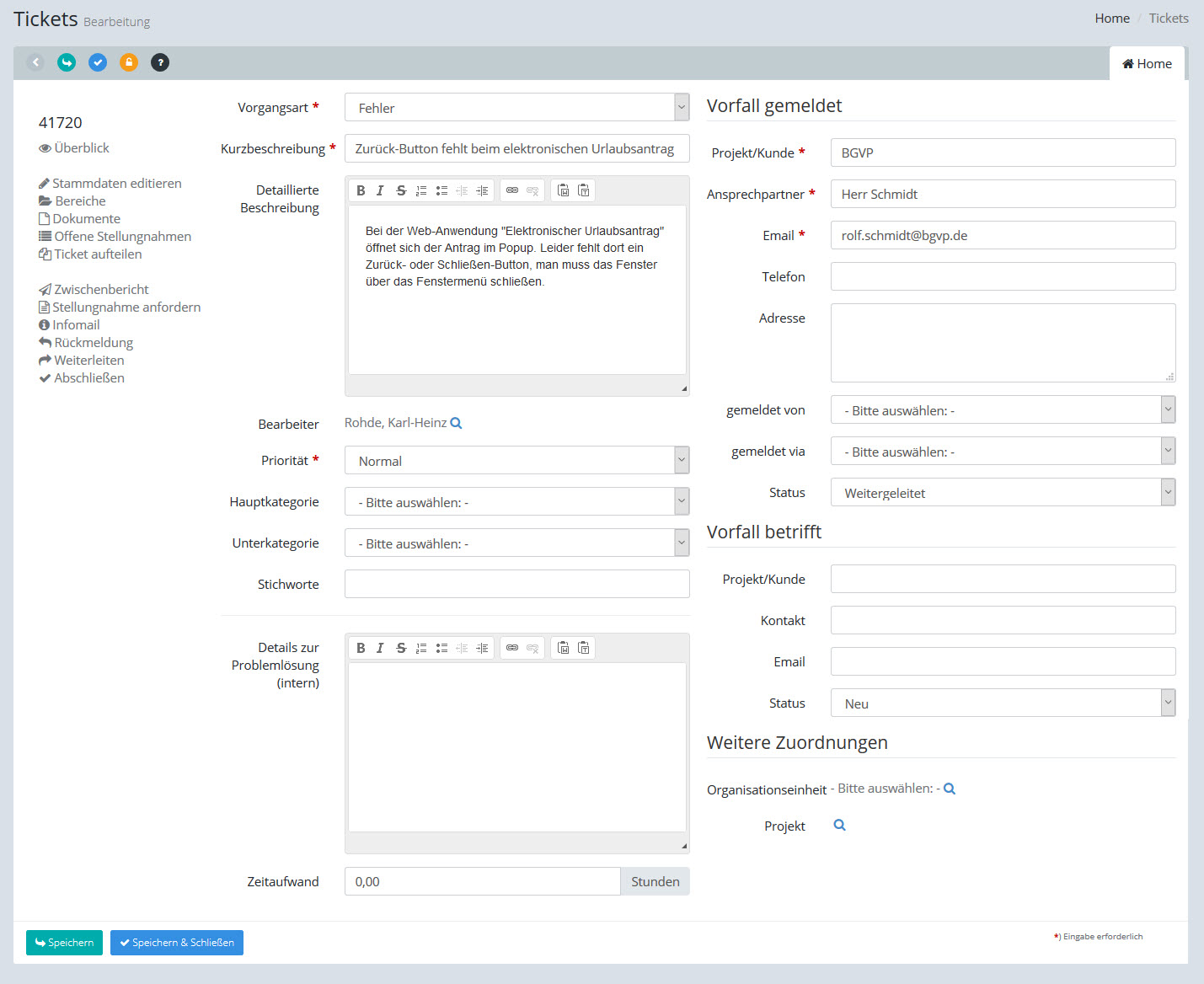 Geben Sie über eine Auswahlliste die Vorgangsart an: Fehler, Frage, Vorschlag oder Vorgang (Musseingabe) |