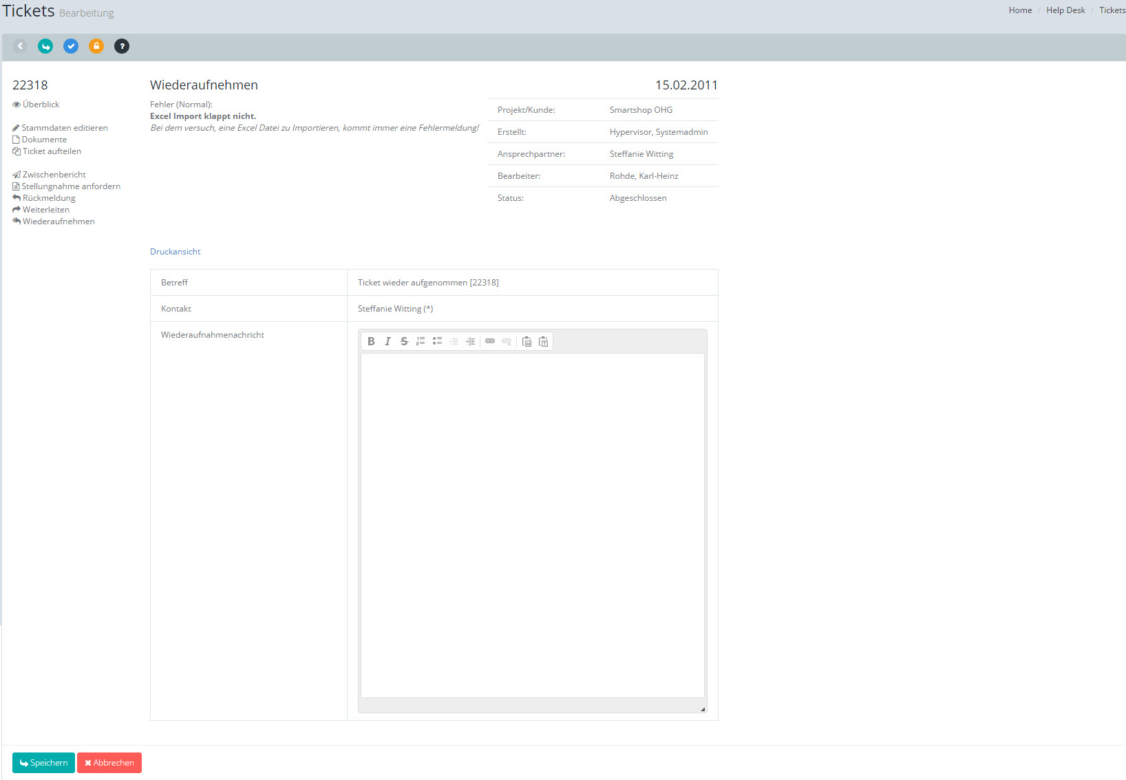 Zeigt die Eingabemaske für ein Ticket, welches weieder aufgenommen wird