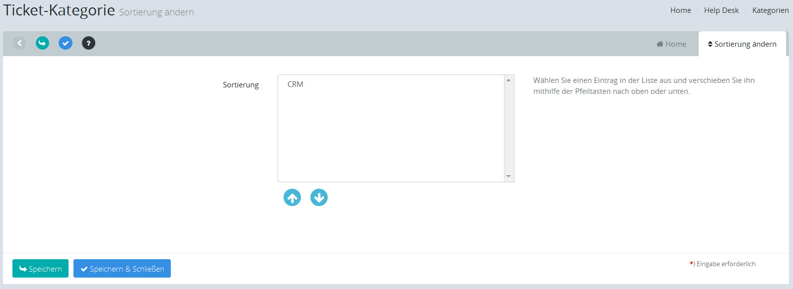 Sie können mit der Sortierung die Reihenfolge der Einträge in der zugehörigen Auswahlliste und der Bearbeitungsliste ändern, indem Sie den jeweiligen Eintrag in dieser Ansicht über die Schaltflächen mit den Pfeil-Symbolen rauf- bzw. runterschieben.