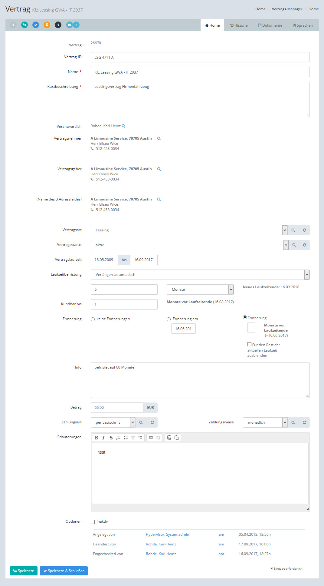 Hier sehen Sie, welche Nutzer diesen Vertrag erstellt, zuletzt geändert sowie zuletzt eingecheckt hat. Klicken Sie auf den Usernamen, um auf die Profilseite des jeweiligen Users zu gelangen. |