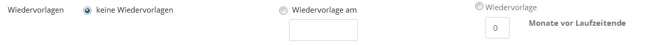 •keine Wiedervorlage: Es wird keine Widervorlage versendet. Vertragsereignisse werden dennoch auf der Homepage des Vertragsmanagers angezeigt. •Wiedervorlage am [Datum]: Zum eingegebenen Datum wird eine Wiedervorlage versendet. •Wiedervorlage x Monate vor Laufzeitende: Wenn Sie hier z. B. "5 Monate vor Laufzeitende" eingeben und der Vertrag endet am 14.09.2016, so wird fünf Monate vorher (14.04.2016) eine Wiedervorlage versendet. |