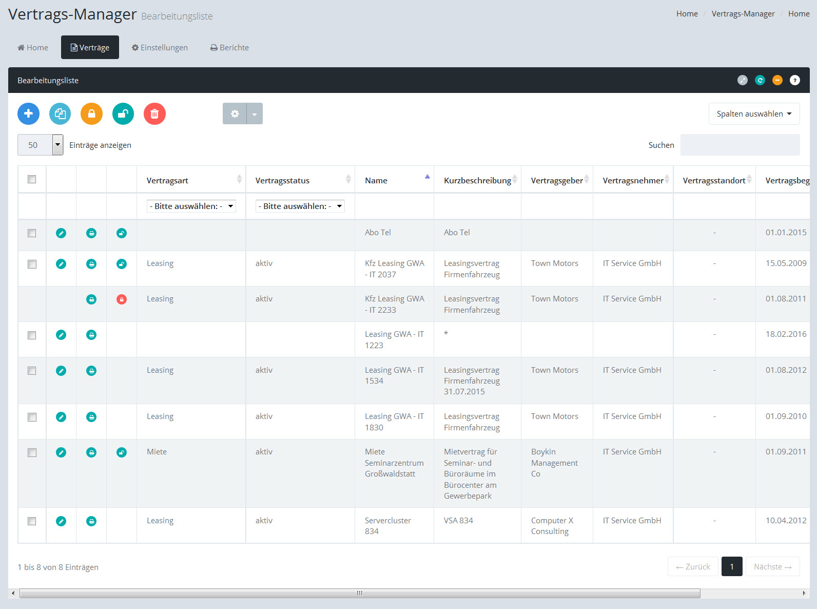 Vertrags-Manager: Bearbeitungsliste der Verträge