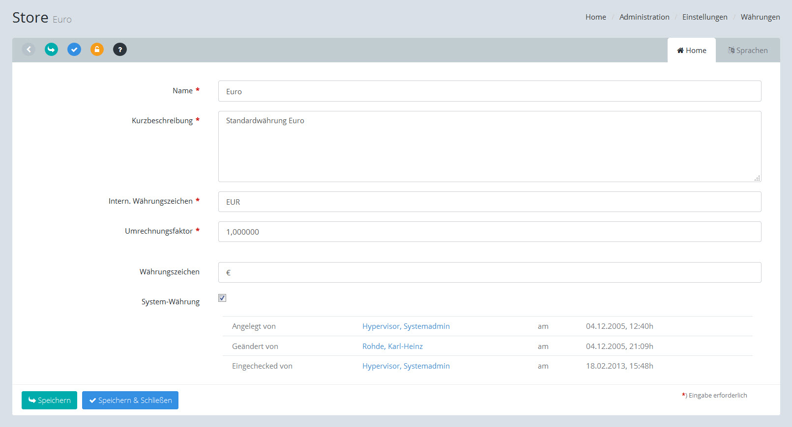 Kurs der Währung in Bezug auf die Systemwährung, deshalb wird hier bei der Systemwährung immer 1,0 eingetragen. Hinweis: Der Umrechnungsfaktor dient lediglich Informationszwecken, eine Währungsumrechnung findet derzeit in hyScore nicht statt. |