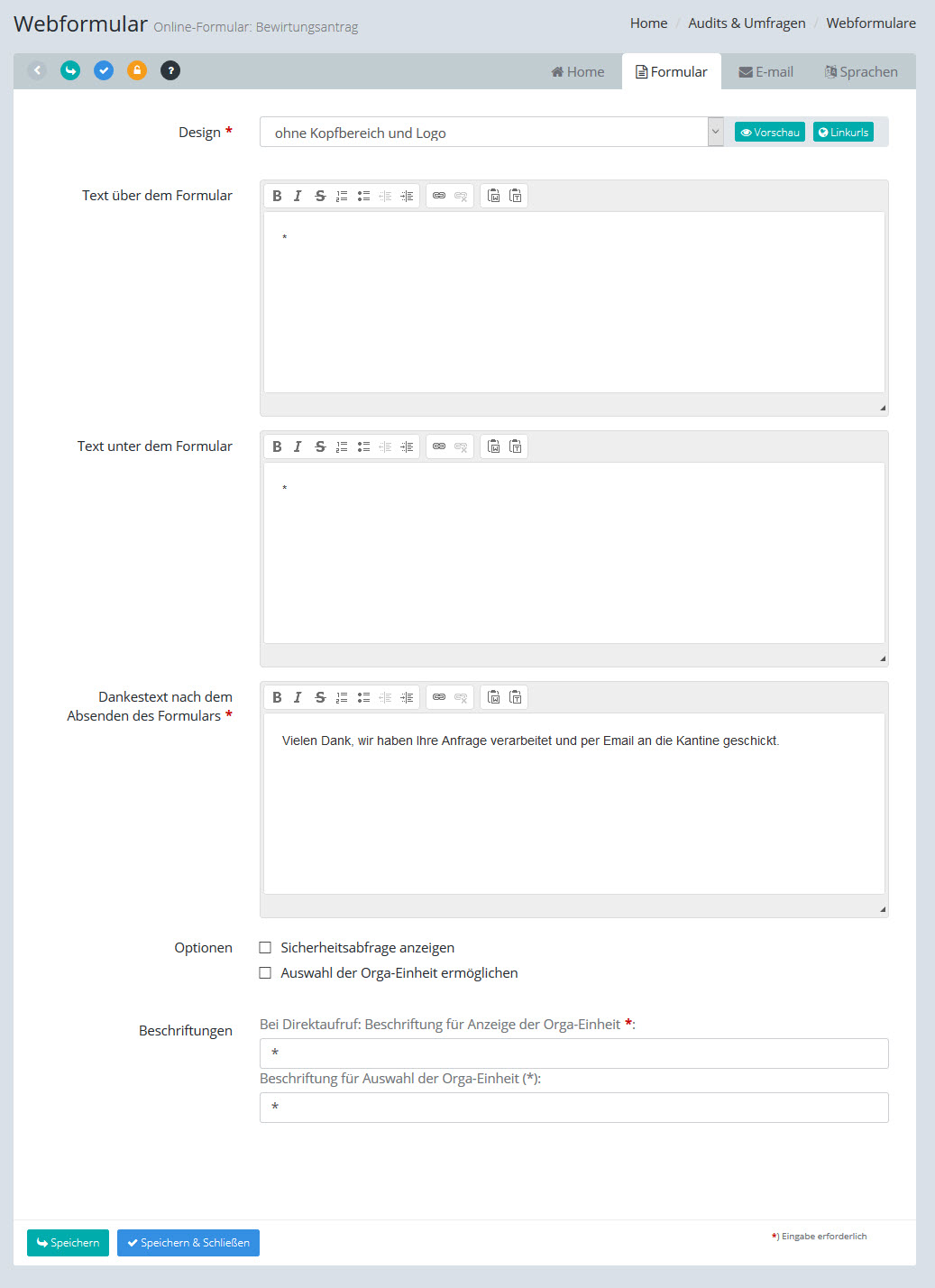 Aktivieren Sie diese Option, wenn der Ausfüller des Formulars die Orgaeinheit / den Store selbst auswählen soll. Der Aufruf des Formulars erfolgt dann über eine allgemeine URL, bei der die ID der Orga-Einheit nicht mit übergeben wird. Die Anzeige des Auswahlfeldes erfolgt im Kopfbereich über dem Formular. Hinweis: Wenn Sie diese Option aktivieren, müssen Sie beide Beschriftungsfelder ausfüllen und ein Design auswählen! Mehr Infos siehe unten: Linkurls |