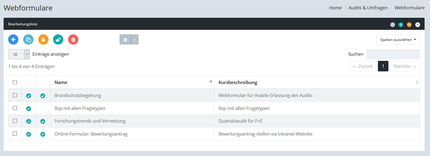 Sie können die Webformulare definieren, indem Sie im Admin-Menü „Audits & Umfragen / Webformulare“ wählen: