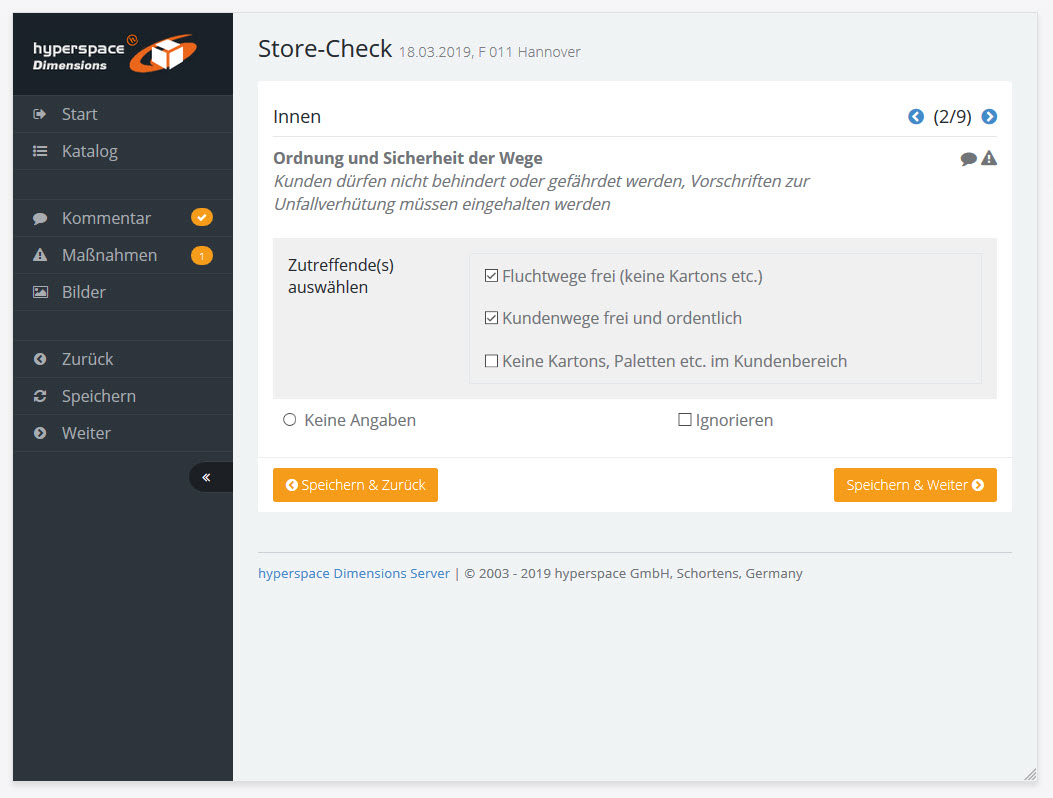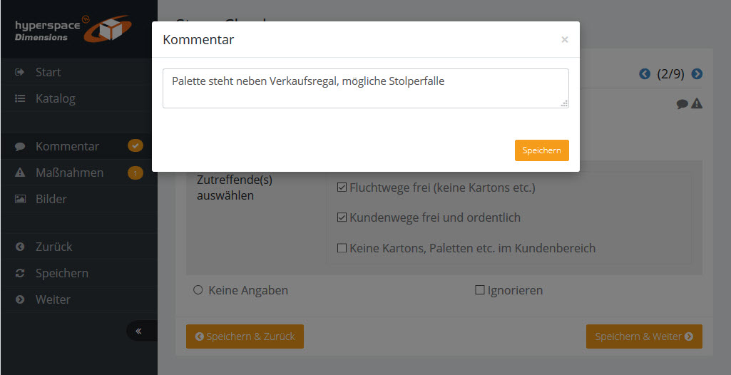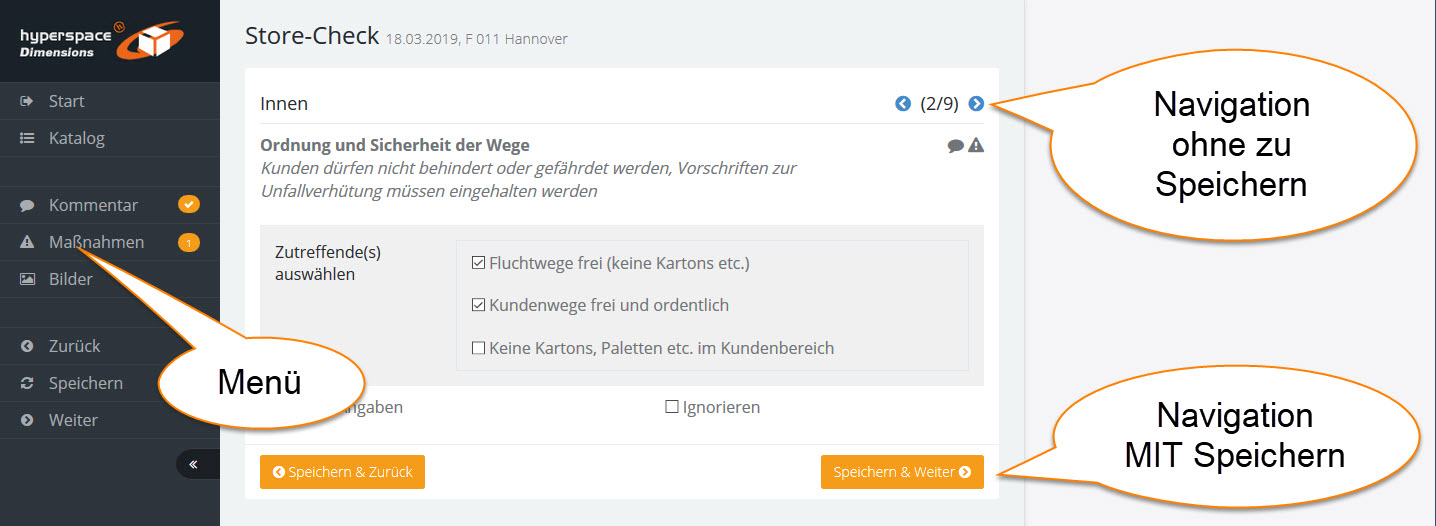 Mit dem linken Menü können Sie innerhalb des Audits navigieren und Kommentare, Maßnahmen und Bilder zur Frageposition erfassen.