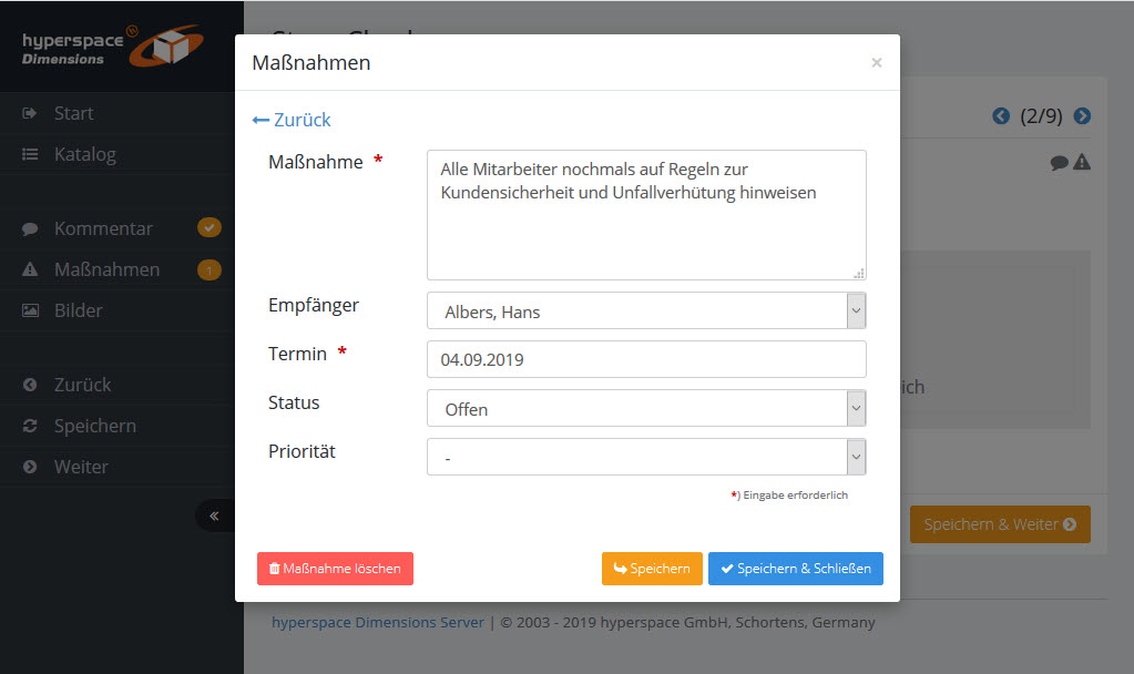 offen: Die Bearbeitung der Maßnahme wurde noch nicht begonnen in Bearbeitung: Die Maßnahme wurde begonnen erledigt: Die Maßnahme ist erledigt Nicht zuständig: Der ausgewählte Empfänger ist der Ansicht, er sei nicht zuständig. Er wählt in diesem Fall den Ersteller der Maßnahme als neuen Empfänger aus. Nicht erledigt / geschlossen: Die Maßnahme kann nicht bearbeitet werden oder ist nicht mehr notwendig |