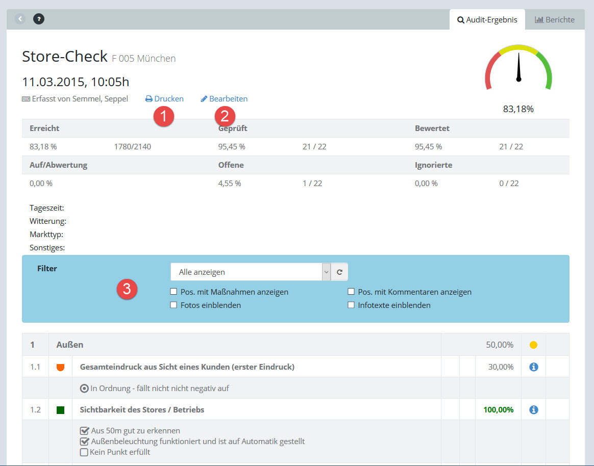 Für jede Position wird der Ampelstatus, die erreichte Punktzahl, die maximal erreichbare Punktzahl und der Zielerreichungsgrad in Prozent dargestellt. (2). Falls vorhanden werden auch Kommentar und Maßnahmen angezeigt.