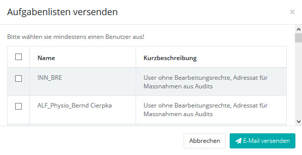 Aufgabenliste per E-Mail an Aufgabenverantwortliche versenden; Sie können die betreffenden Empfänger durch Ankreuzen auswählen: