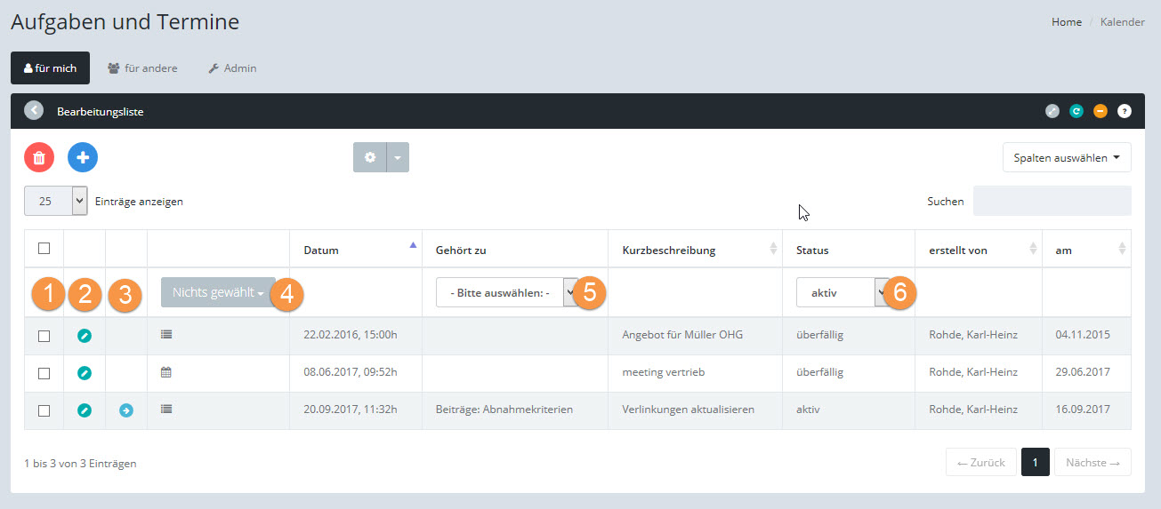 Die Liste zeigt Aufgaben, Anrufe, Termine etc. auf drei verschiedenen Registerkarten an: