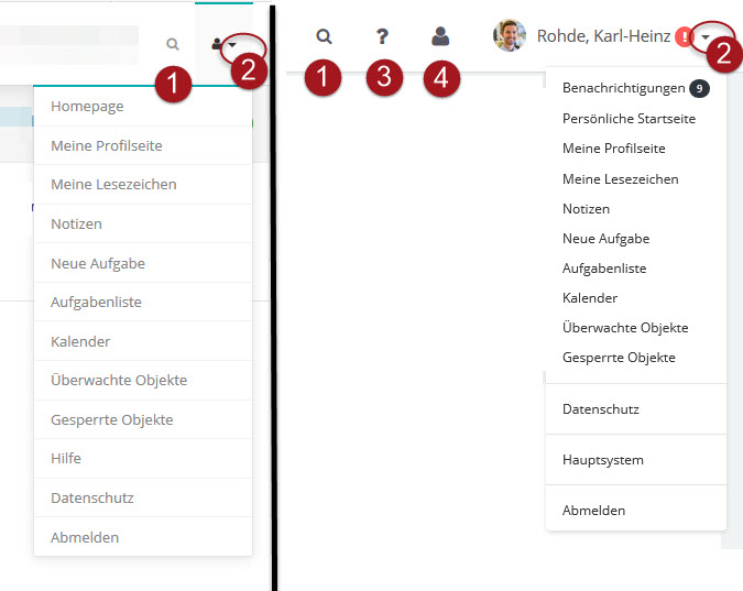 Klicken Sie in der Kopfleiste der Website auf den kleinen Pfeil (2) neben dem Benutzer-Icon, um das Benutzermenü zu öffnen.