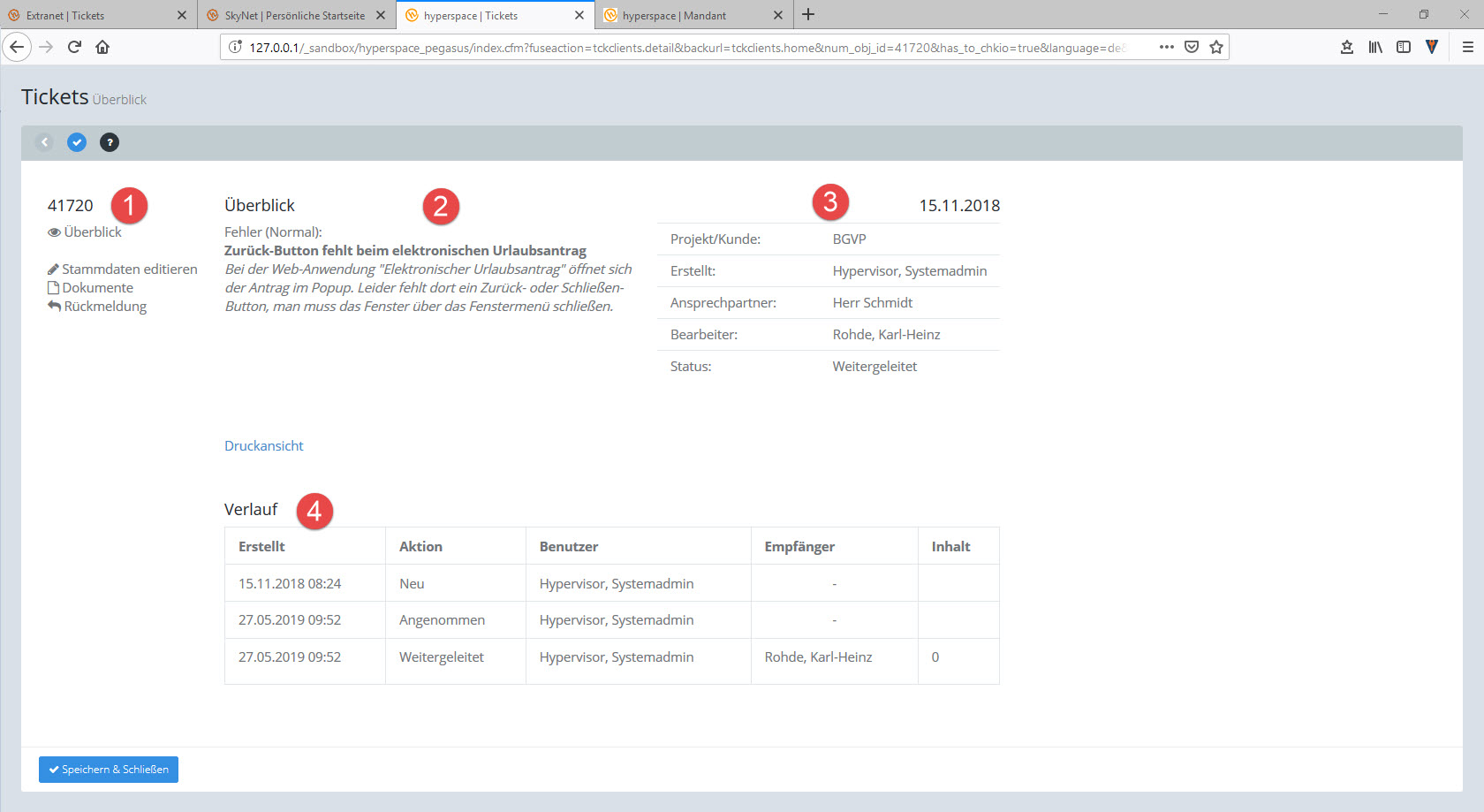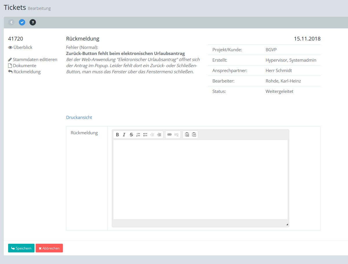 Die Rückmeldung wird dann gespeichert und erscheint als neuer Eintrag im Ticketverlauf.