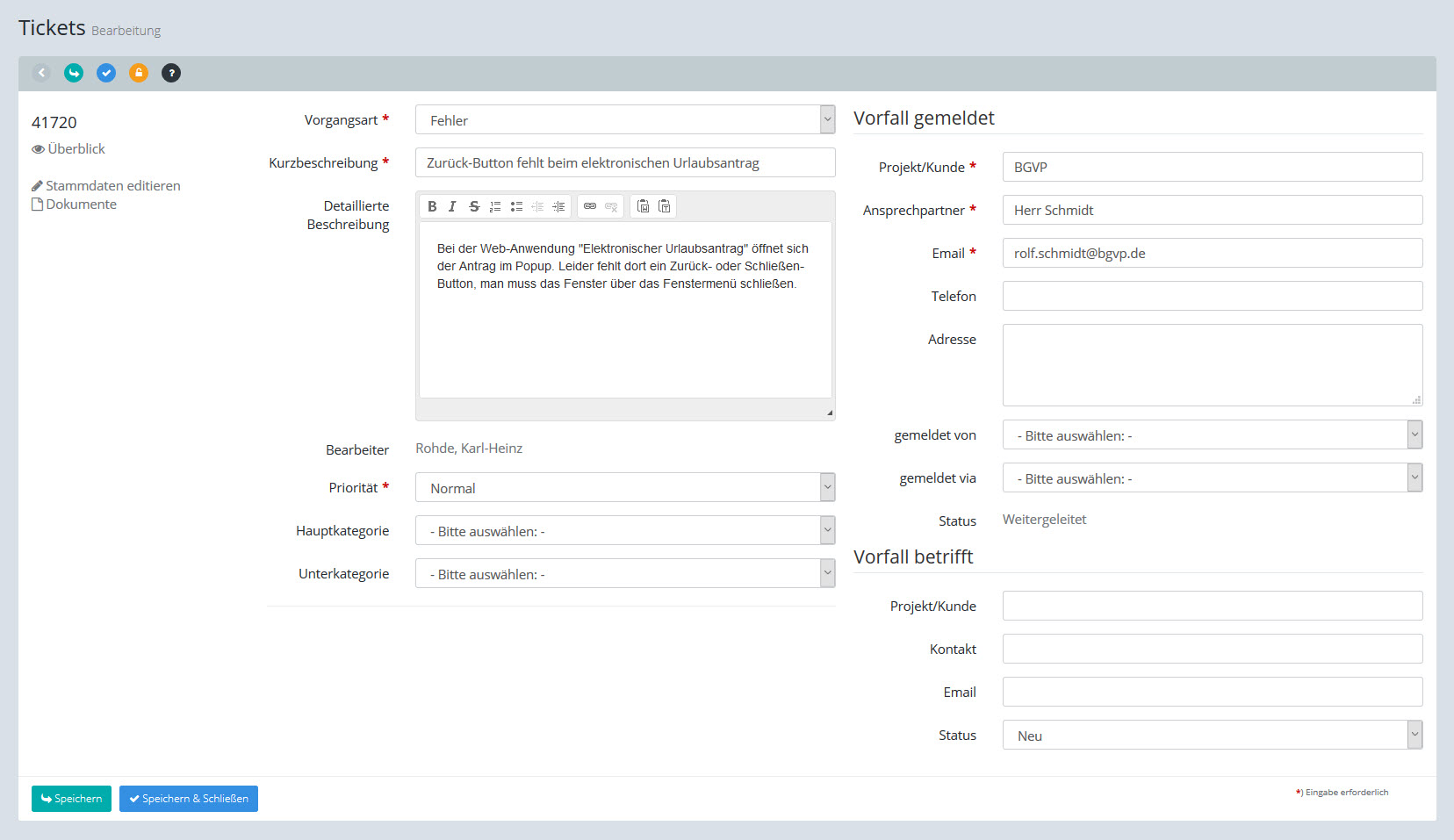 Der Bearbeiter wird von einem Ticket-Bearbeiter festgelegt und hier nur angezeigt. |