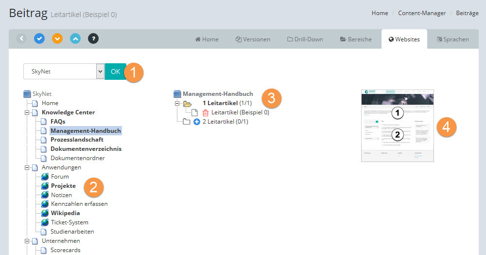 Mittels der Registerkarte "Websites" können Sie Inhalte auf einer Website veröffentlichen. Diese Registerkarte steht auf einigen, aber nicht allen Anwendungsbildschirmen zur Verfügung (derzeit: Beiträge, Dokumente, FAQ, Linkobjekte).