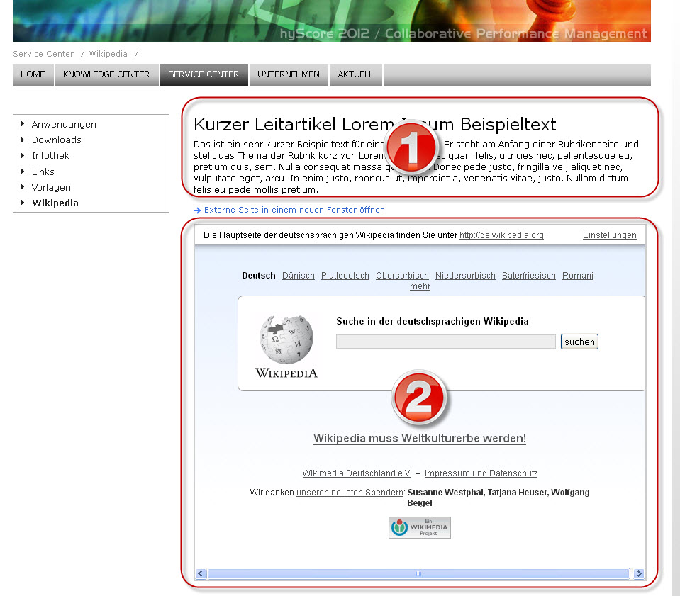 Mit Hilfe einer Linkseite können Sie externe Internetseiten in das hyScore-Intranet integrieren. Der Aufruf der externen Seite erfolgt dabei in einem eingebetteten Fenster, dem sogenannten iFrame.