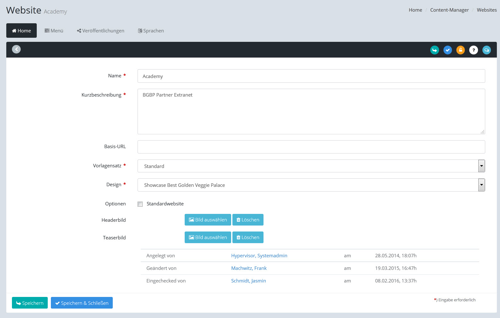Die Stammdaten zu einer Website: